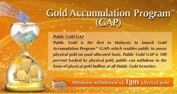 GAP bermaksud Gold Accumulation Program. Ia merupakan satu program simpanan emas Public Gold yang berketulenan 999 dan boleh dibeli serendah RM100.