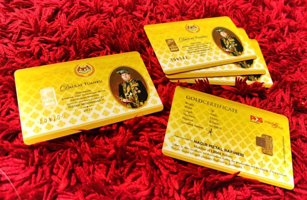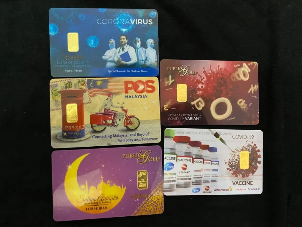 Contoh gold bar public Gold yang kini jadi rare item adalah gold bar keluaran khas Yang Di-Pertuan Agong Muhammad V dan gold bar Coronavirus berwarna biru.